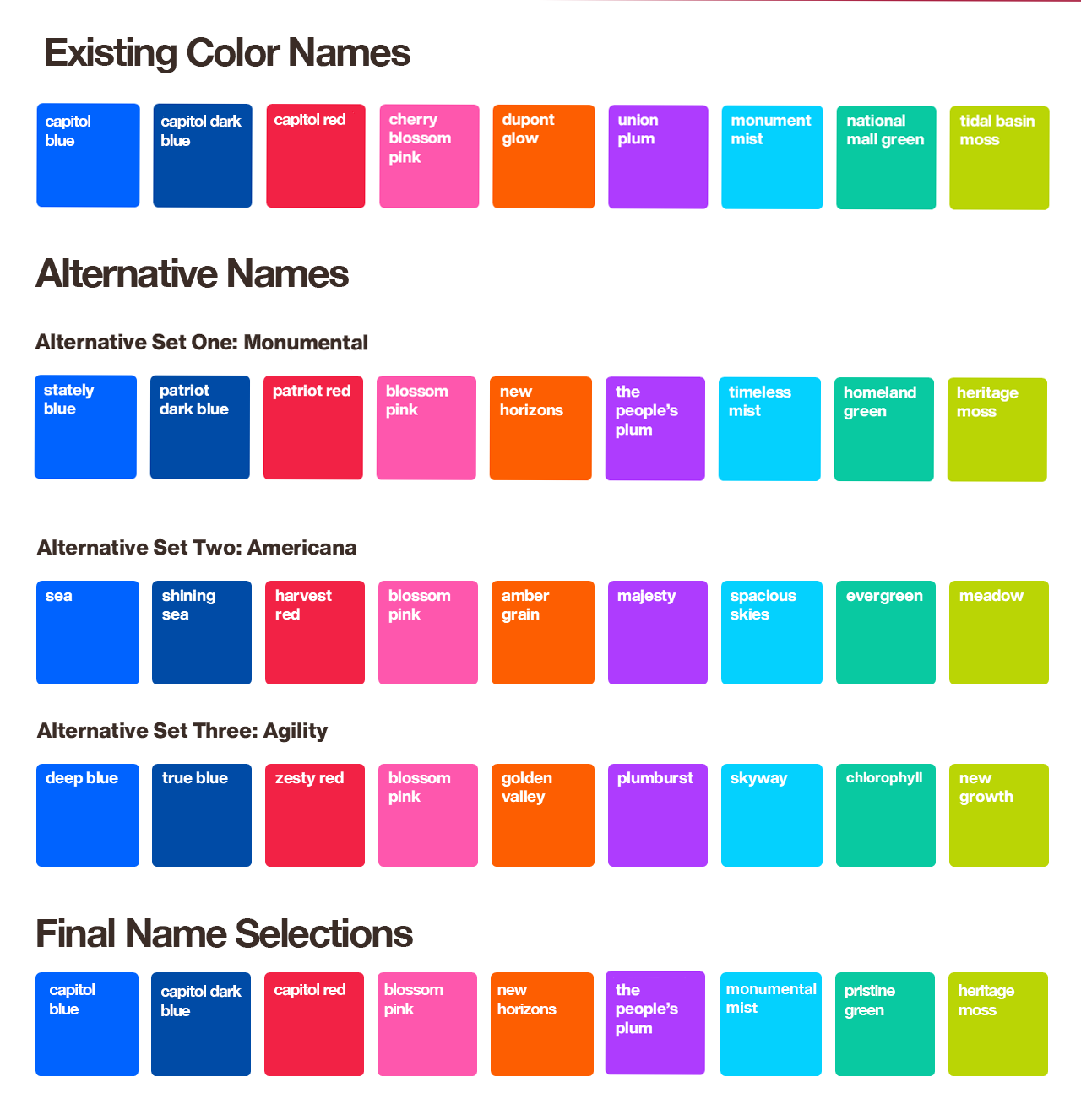 I was asked to rename brand colors that were a little too DC-centric for a transit system reaching far beyond the city borders. I used brand attributes to inform a series of alternatives.